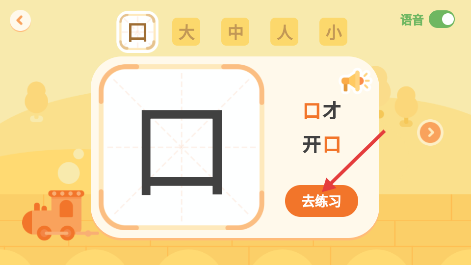3、进入所选册数的识字页面,点击【练习】可切换至该汉字的练习环节。