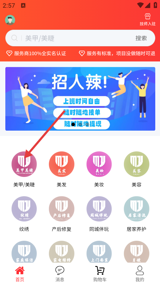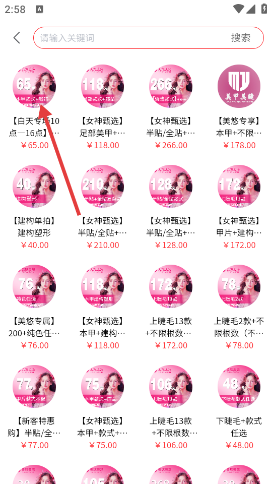 1、在首页点击【美甲/美睫】图标,进入美甲美睫服务列表页面。