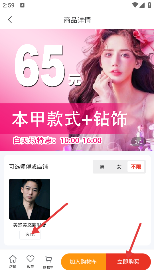 3、在商品详情页,可选师傅或店铺,然后点击【立即购买】按钮。