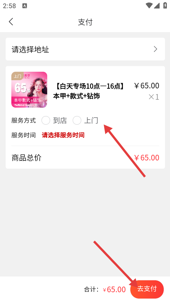 4、在支付页面,选择地址、服务方式和服务时间后,点击【去支付】完成付款。