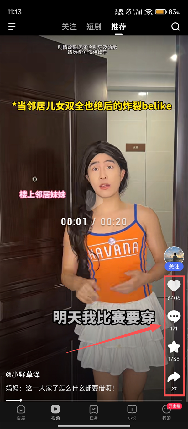 3、看到感兴趣的视频,点击右侧【评论】按钮,可查看其他用户的互动内容,也能参与其中。