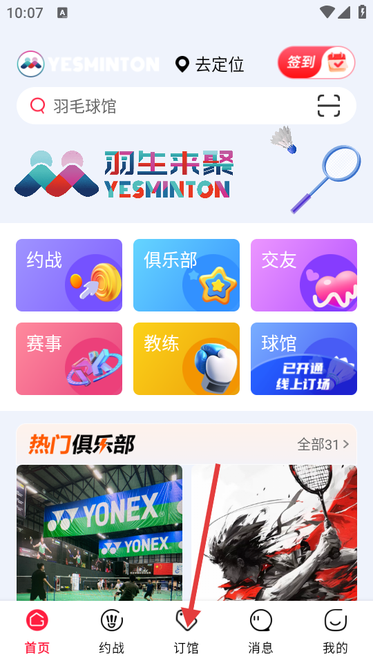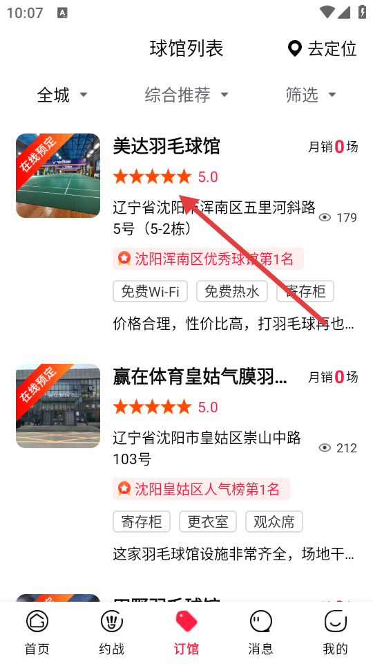 1、打开app,点击底部导航栏中的【订馆】选项,进入球馆列表页面。