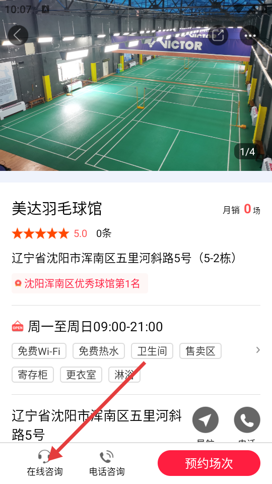 3、在美达羽毛球馆详情页面,点击【在线咨询】按钮,进入与该球馆的聊天页面。