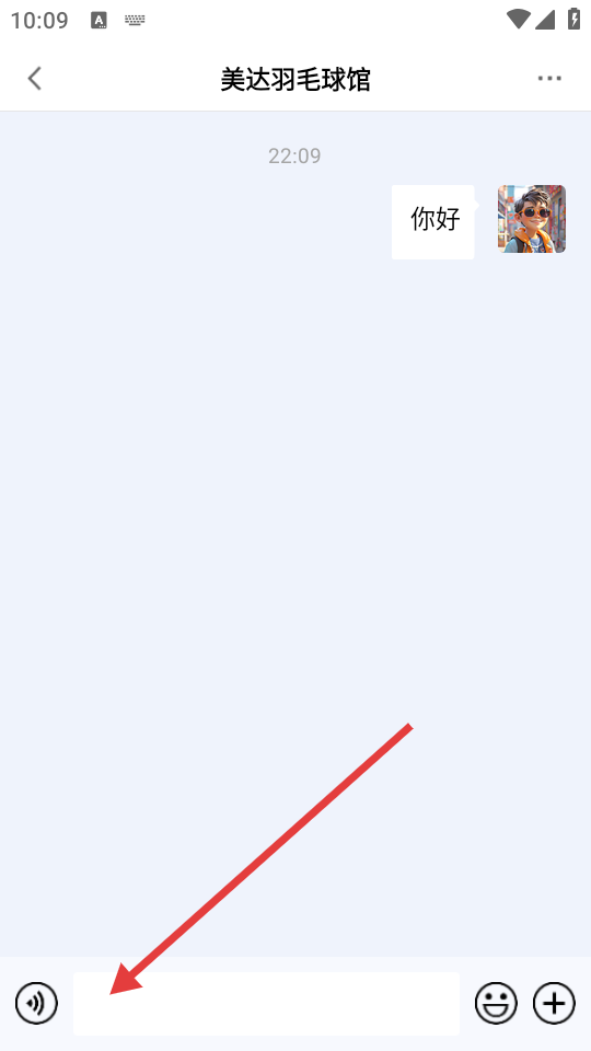 4、在聊天页面的输入框中输入内容,即可与美达羽毛球馆进行在线咨询交流。