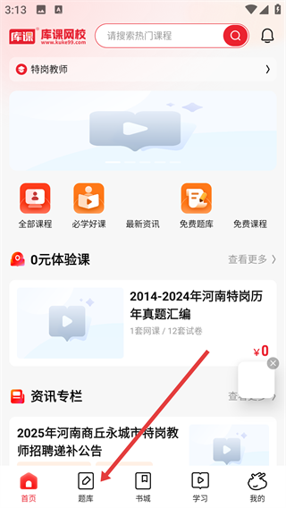 1、我们点击底部【题库】,进入刷题页面,可看到学科分类,为刷题做好准备哦。