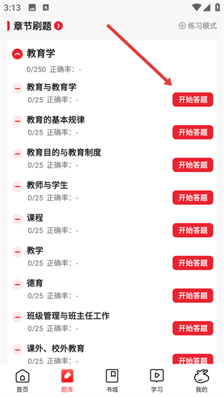 3、在学科刷题板块,点击章节旁的【开始答题】,即可进入具体章节的刷题环节啦。