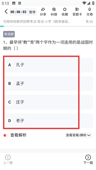 4、在答题界面,根据题目选择对应选项,还可查看解析,巩固知识点哦。