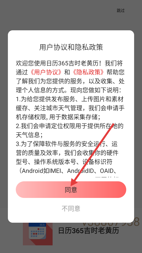1、在【用户协议和隐私政策】弹窗中,点击【同意】按钮,进入应用。