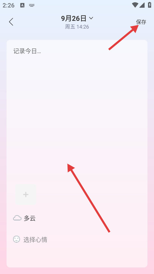 4、在日记编辑页面,输入要记录的内容,完成后点击【保存】按钮,保存日记。