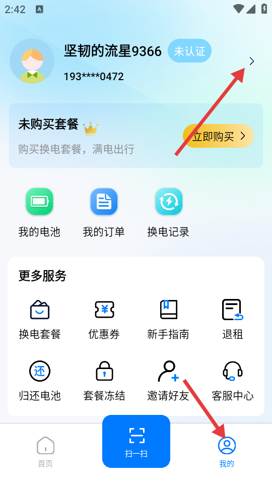 1、打开app,进入个人页面后,点击右上角箭头所指区域,进入个人信息设置页面。