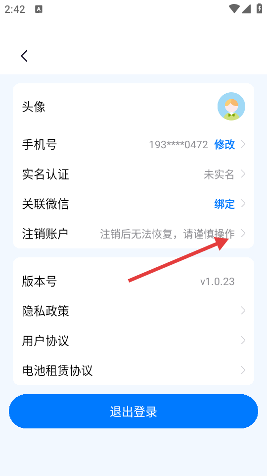 2、在个人信息设置页面,点击【注销账户】选项,进入账户注销须知页面。