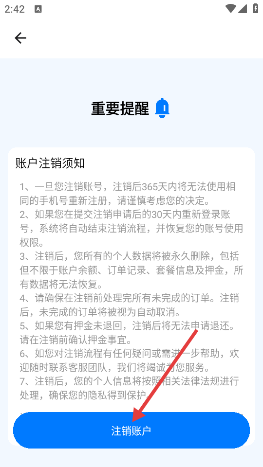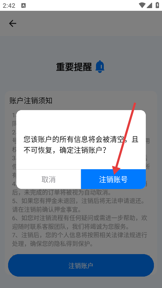 3、在账户注销须知页面,阅读须知后,点击【注销账户】按钮,弹出确认注销弹窗。