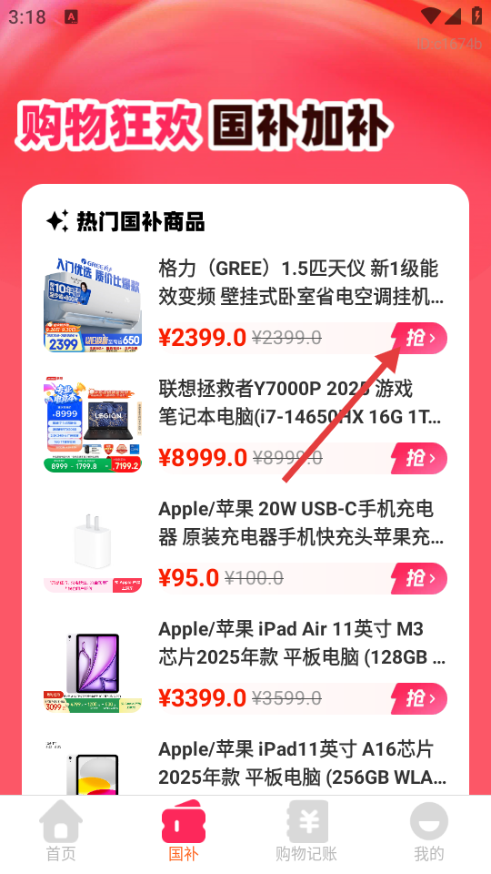 2、在国补页面,选择要抢购的热门国补商品,点击商品旁的【抢】按钮,进入商品详情页面。