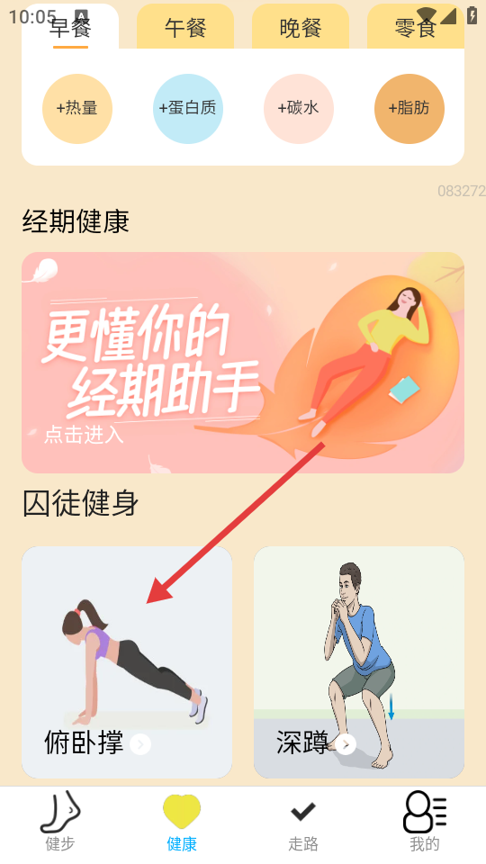 2、在健康页面,选择要进行的健身项目,例如“俯卧撑”,进入该健身项目的具体页面。