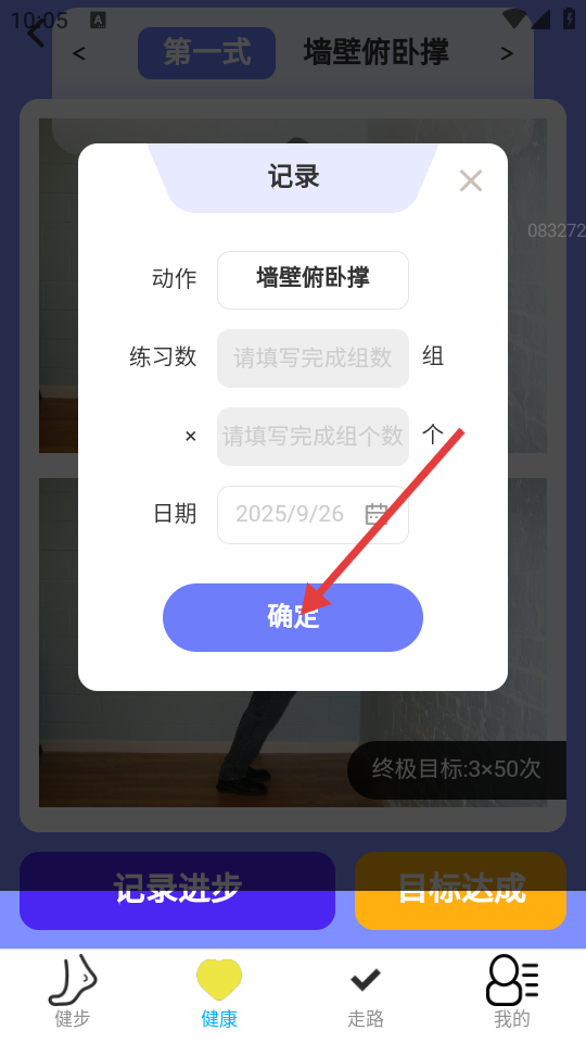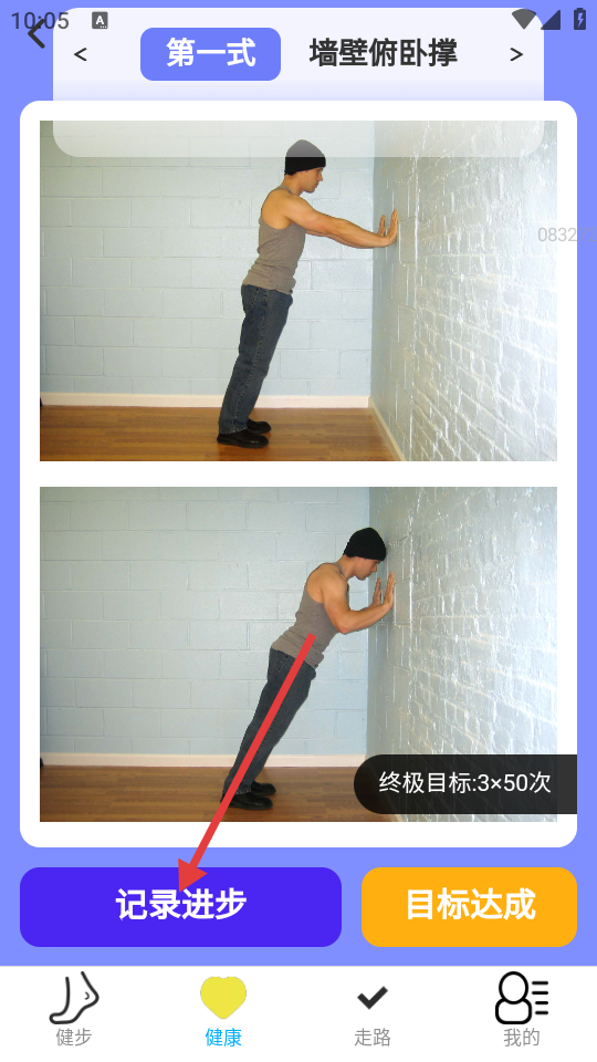 3、以“墙壁俯卧撑”为例,在其页面,点击【记录进步】按钮。