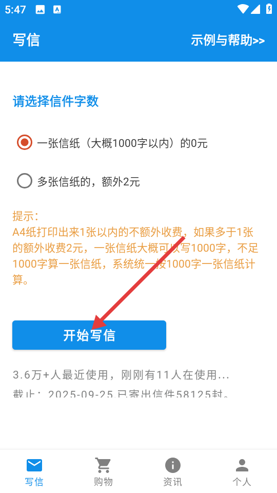 1、在写信页面,选择信件字数,点击【开始写信】按钮,进入填写信件内容页面。