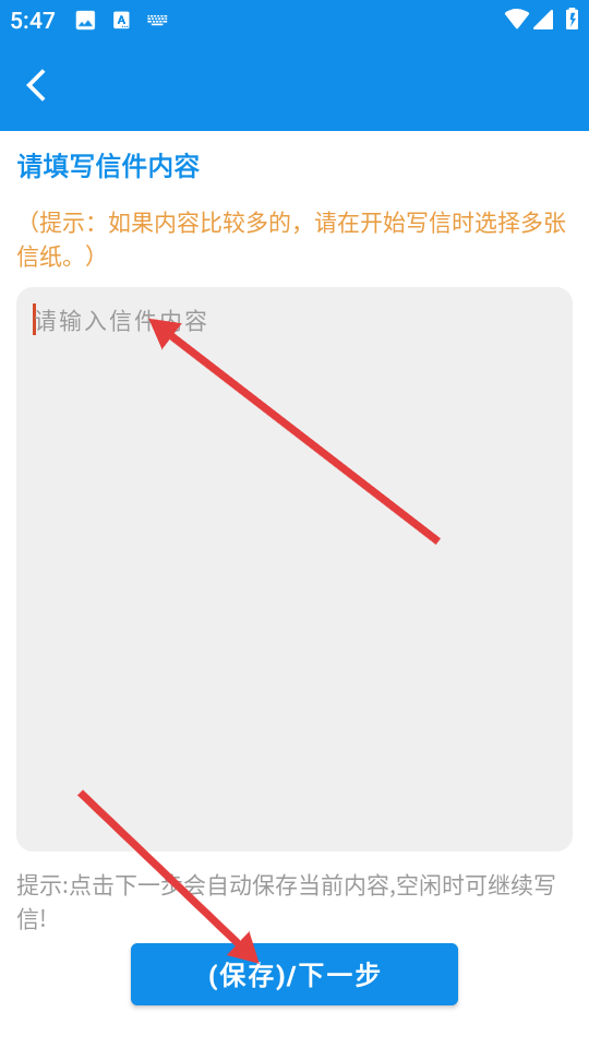 2、在填写信件内容页面,输入信件内容后,点击【(保存)/下一步】按钮。
