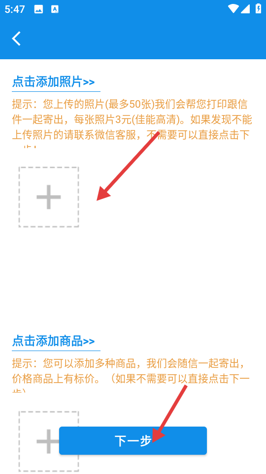 3、在添加照片和商品页面,可点击“+”号添加照片,也可点击添加商品,点击【下一步】按钮,进入确认订单页面。