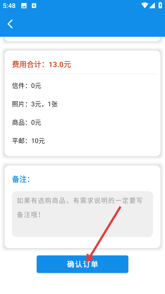 4、在确认订单页面,查看费用合计等信息,若有需求可在备注栏填写,最后点击【确认订单】按钮,完成订单确认。
