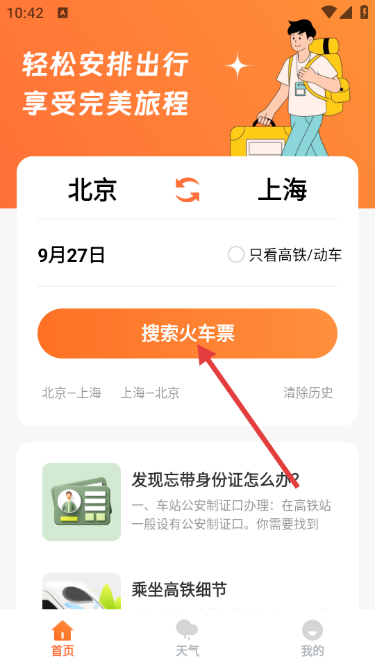 2、在主界面,确认出发地和目的地,选择日期,点击【搜索火车票】。