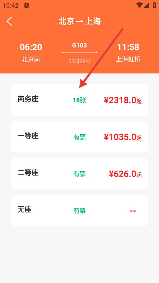 4、进入所选车次详情页,可查看不同座位类型的余票及价格情况。