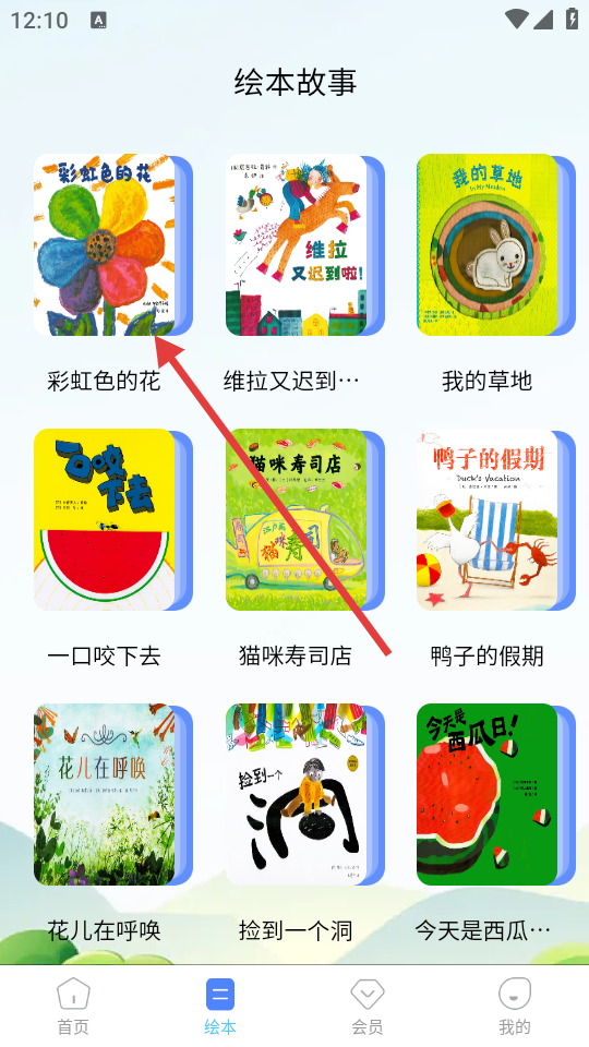 3、在绘本故事页面,选择想要阅读的绘本,如【彩虹色的花】,进入该绘本详情页。