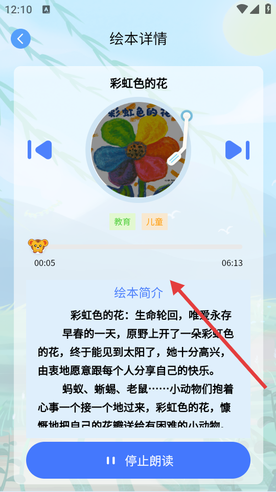 4、在绘本详情页,可查看绘本简介,还能进行播放、停止朗读等操作,开启绘本阅读体验。