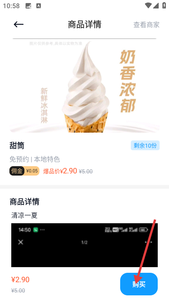 3、在甜筒商品详情页,点击【购买】,进入支付页面。