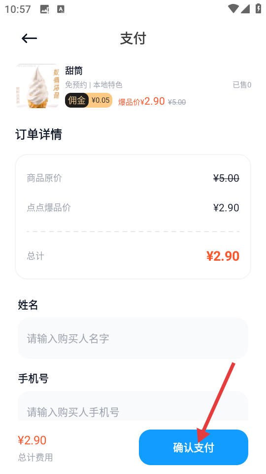 4、在支付页面,输入购买人姓名、手机号,点击【确认支付】,完成甜筒的购买支付操作。
