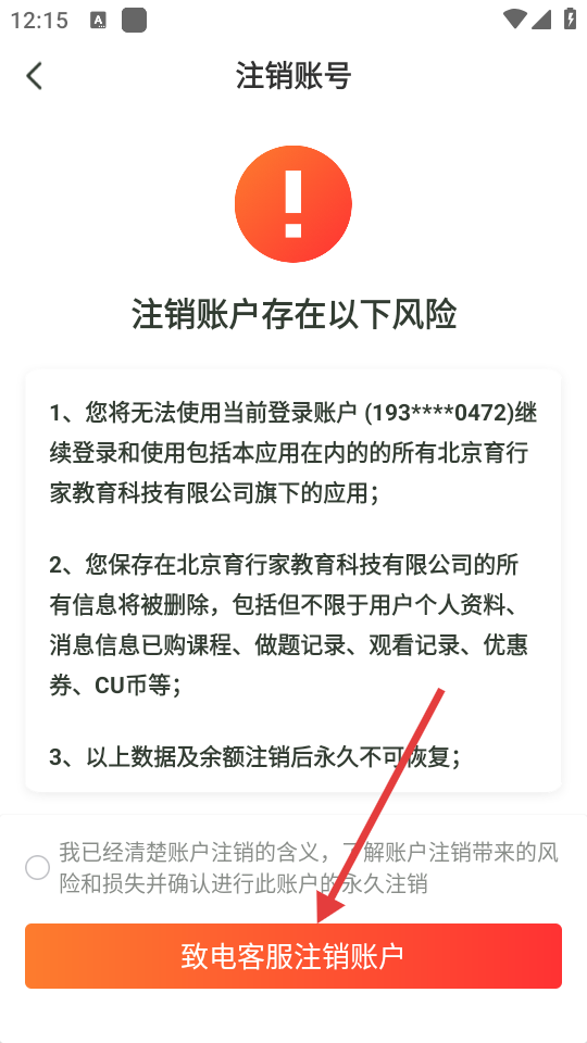 4、在注销账号页面,仔细阅读注销账户的风险提示后,点击【致电客服注销账户】,联系客服完成账户注销操作。