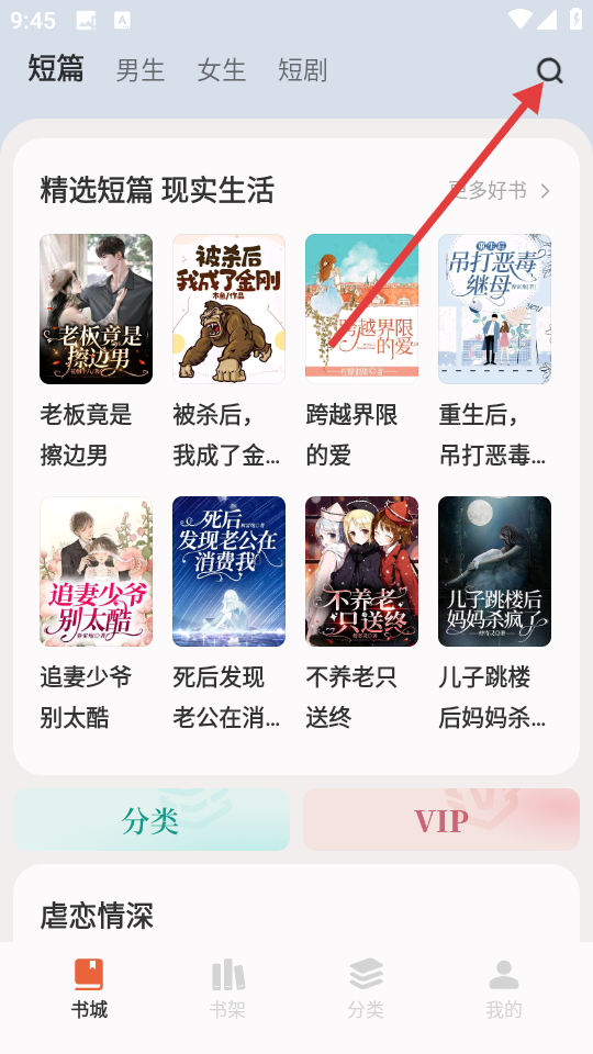 2、进入书城页面后,点击右上角搜索图标,进行搜索。