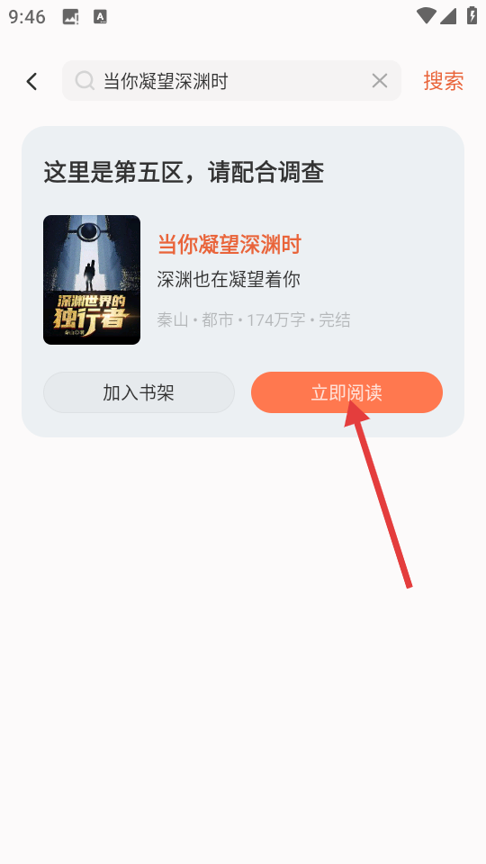 3、输入要找的小说名称,在搜索结果页面,选择目标小说,点击【立即阅读】。