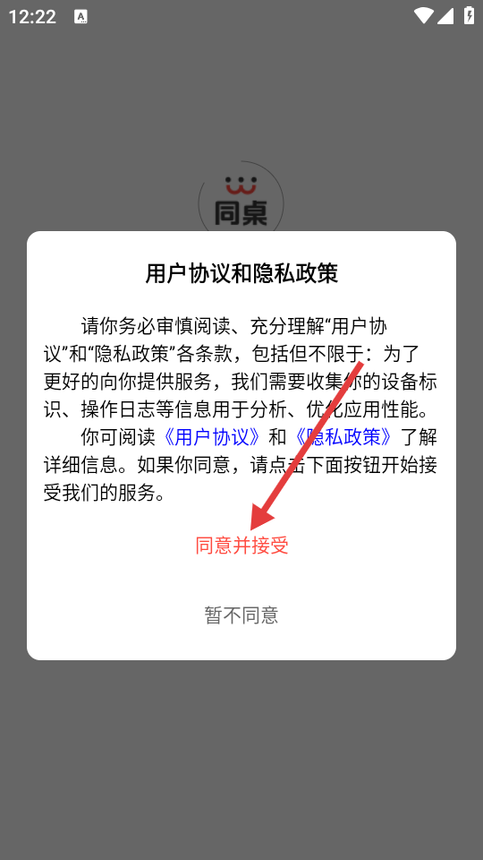 1、首次使用时,阅读【用户协议和隐私政策】,点击【同意并接受】,进入APP。