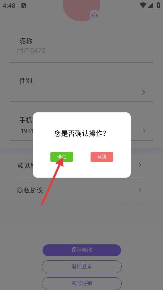 4、当弹出提示框时,点击【确定】按钮,完成账号注销操作。