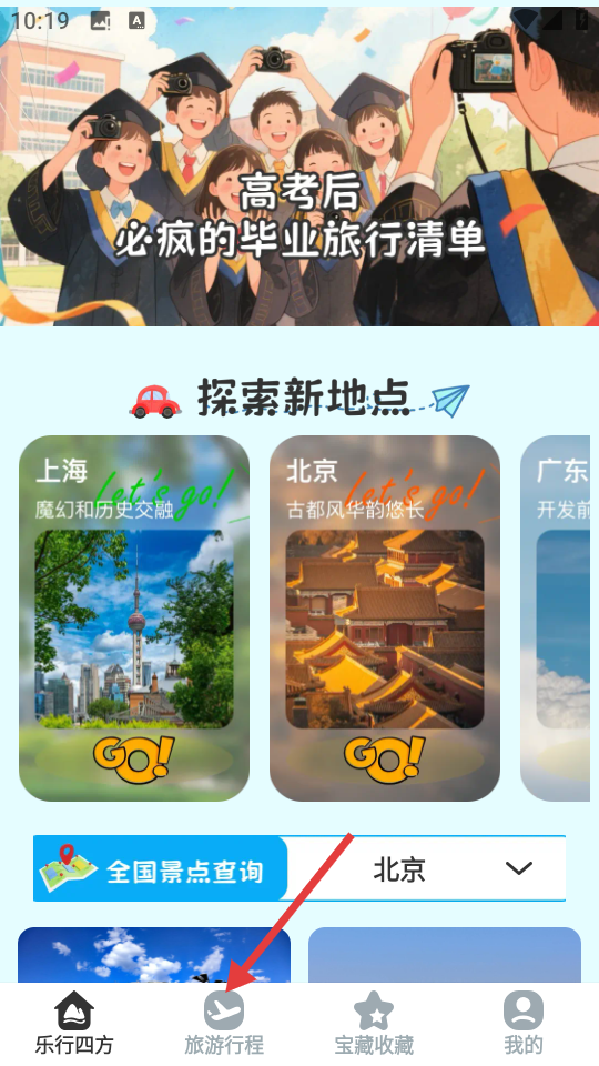 2、进入APP后,点击底部导航栏中的【旅游行程】选项,进入行程广场页面。