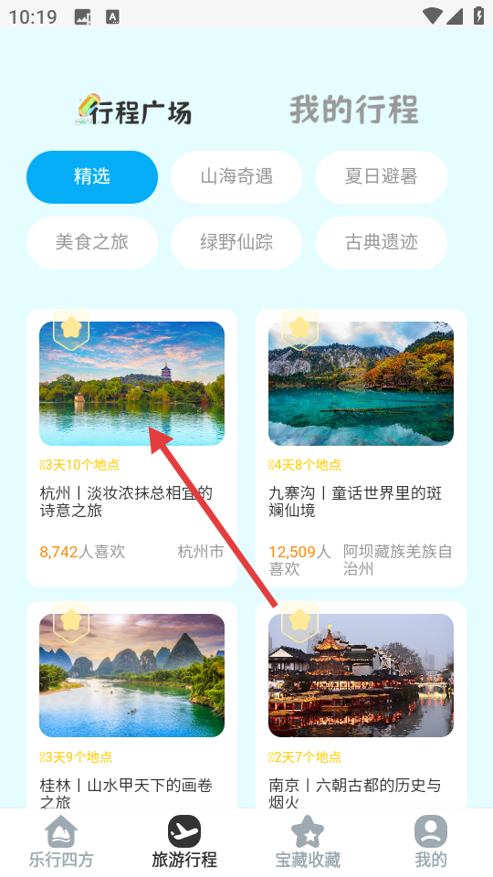 3、在行程广场页面里,选择自己感兴趣的行程,点击该行程卡片进入详情页。