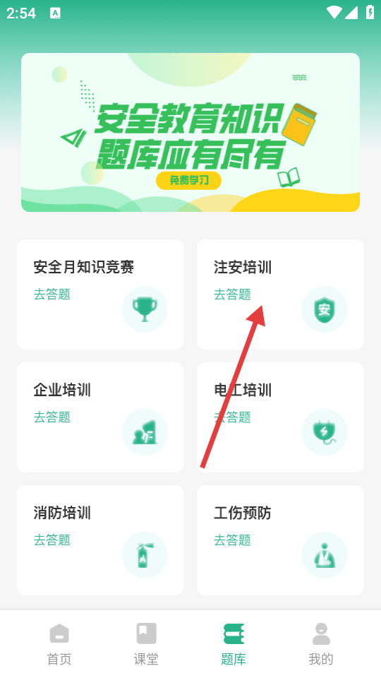 1、在首页,点击底部导航栏中的【题库】按钮,进入题库页面。