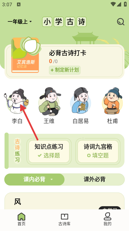 1、在APP首页,点击“李白”选项,进入李白的古诗列表页面。