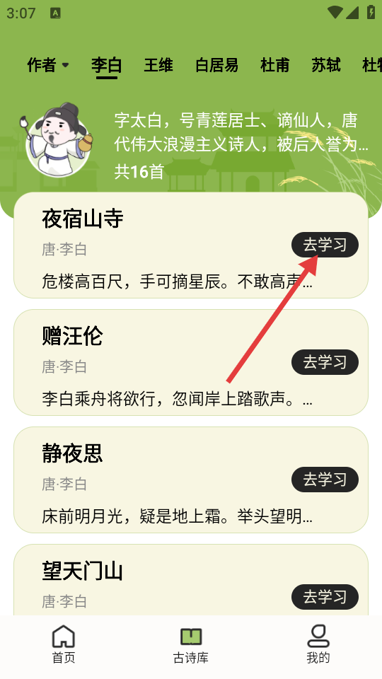 2、在李白的古诗列表页面中,找到《夜宿山寺》,点击其右侧的【去学习】按钮。
