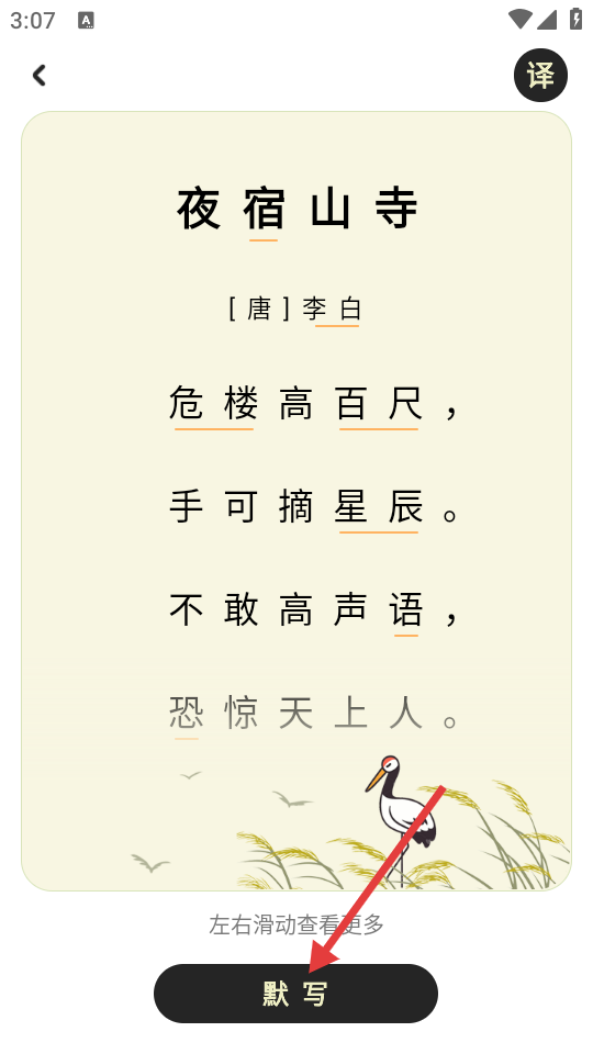 3、在《夜宿山寺》古诗详情页,点击【默写】按钮,进入默写练习界面。