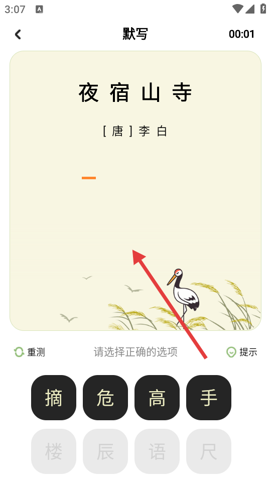 4、进入默写练习界面后,即可根据提示进行《夜宿山寺》的默写练习。