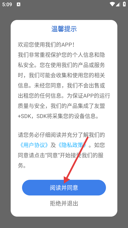 1、在弹出的温馨提示窗口中,点击【阅读并同意】按钮,完成《用户协议》及《隐私政策》确认。