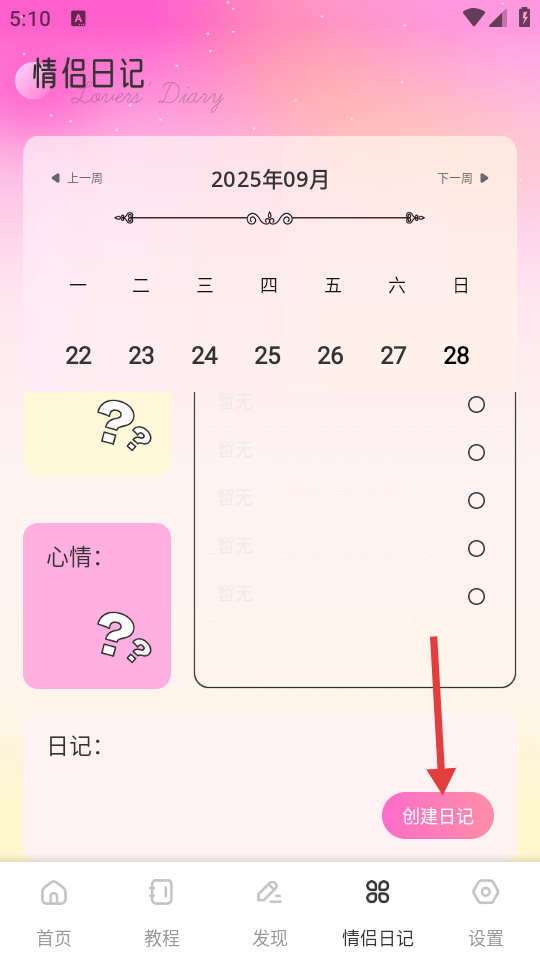 3、在情侣日记页面,点击【创建日记】按钮,进入创建日记页面。