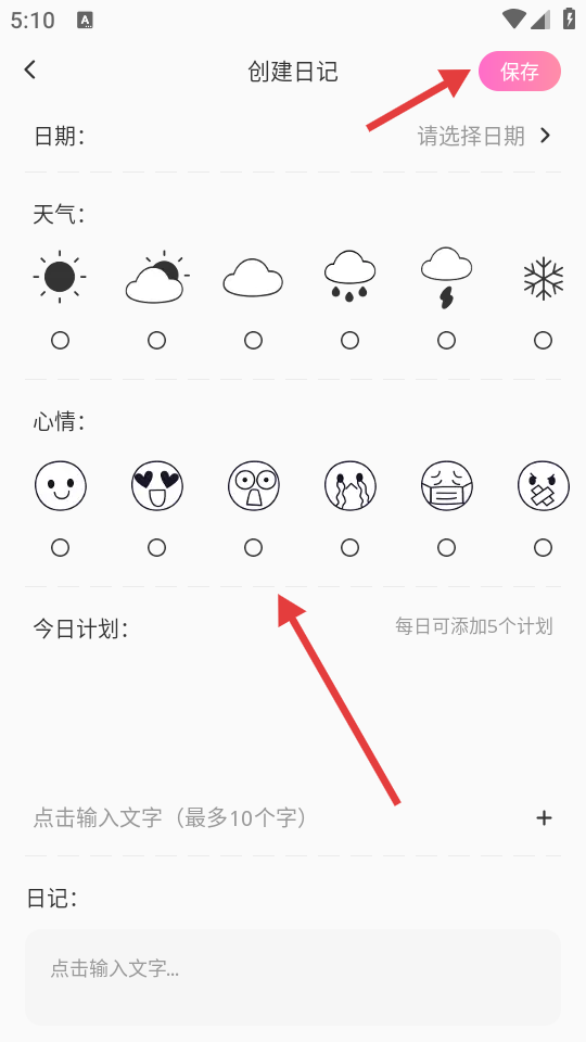 4、在创建日记页面,选择日期,勾选天气、心情选项等内容,最后点击【保存】按钮,完成日记创建。