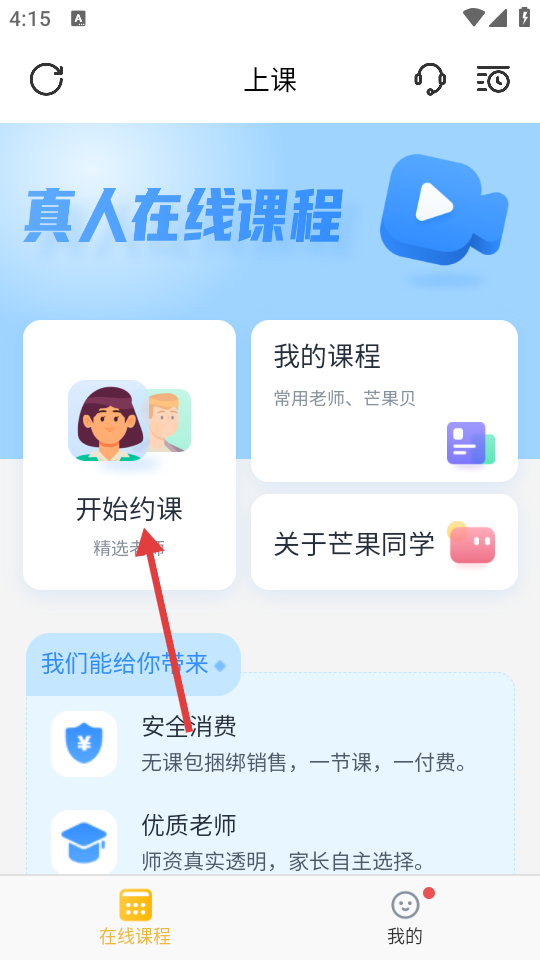 1、在“在线课程”页面,点击【开始约课】按钮,进入老师选择页面。