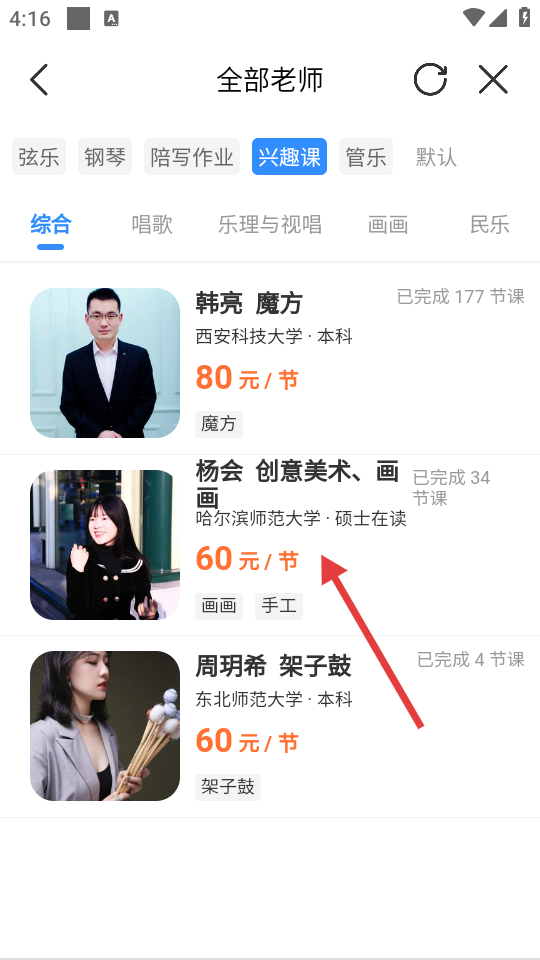 2、在老师选择页面,选择感兴趣的老师,点击进入该老师的课程预约页面。