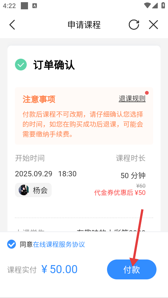 4、进入申请课程的订单确认页面,确认课程信息无误,点击【付款】按钮完成课程预约支付。