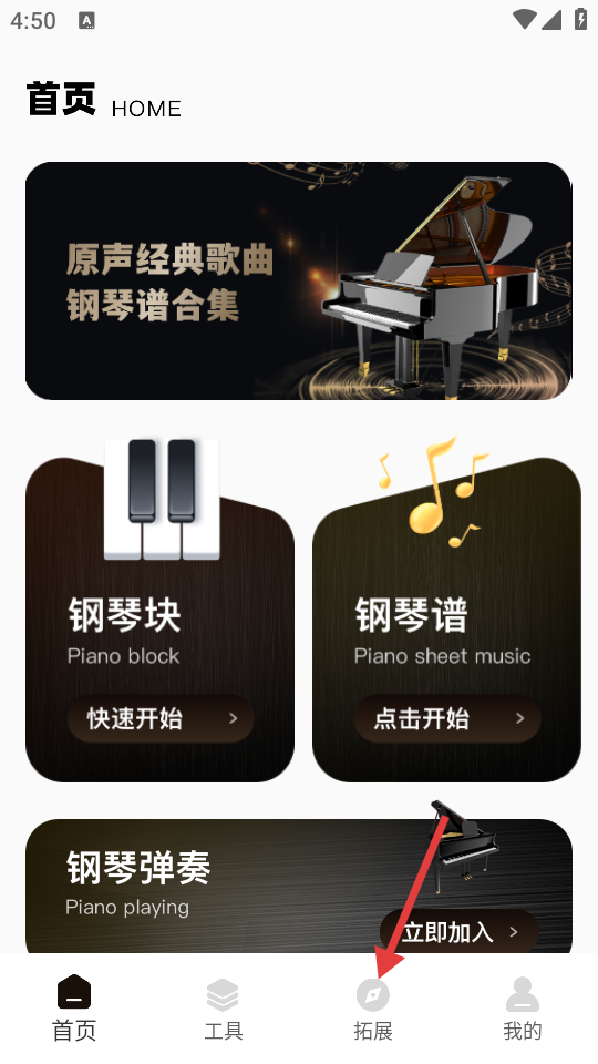 1、在首页中,点击底部拓展功能。