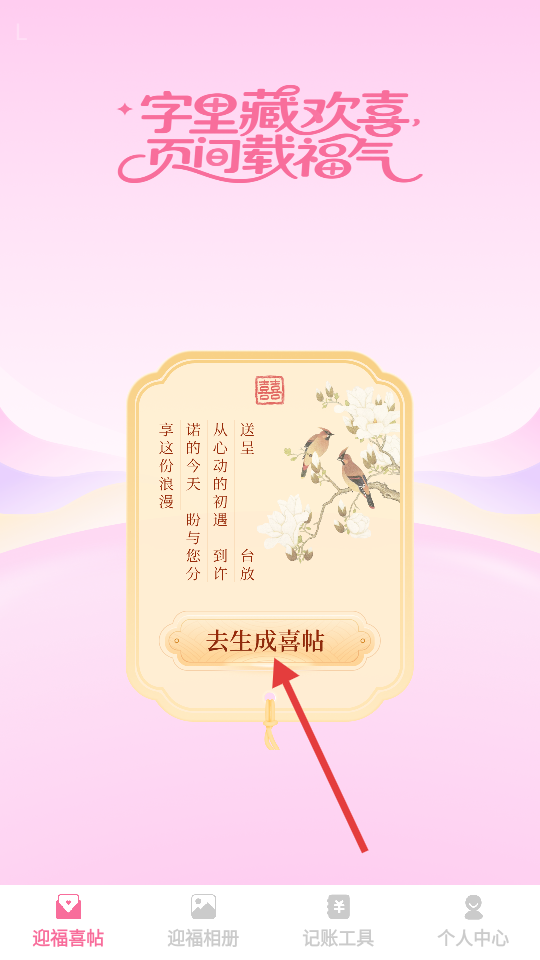 1、在迎福喜帖页面,点击【去生成喜帖】按钮,开启喜帖生成流程。