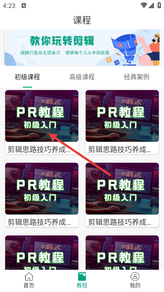 3、在教程页面,选择想要学习的课程,比如【PR教程-初级入门】类课程。